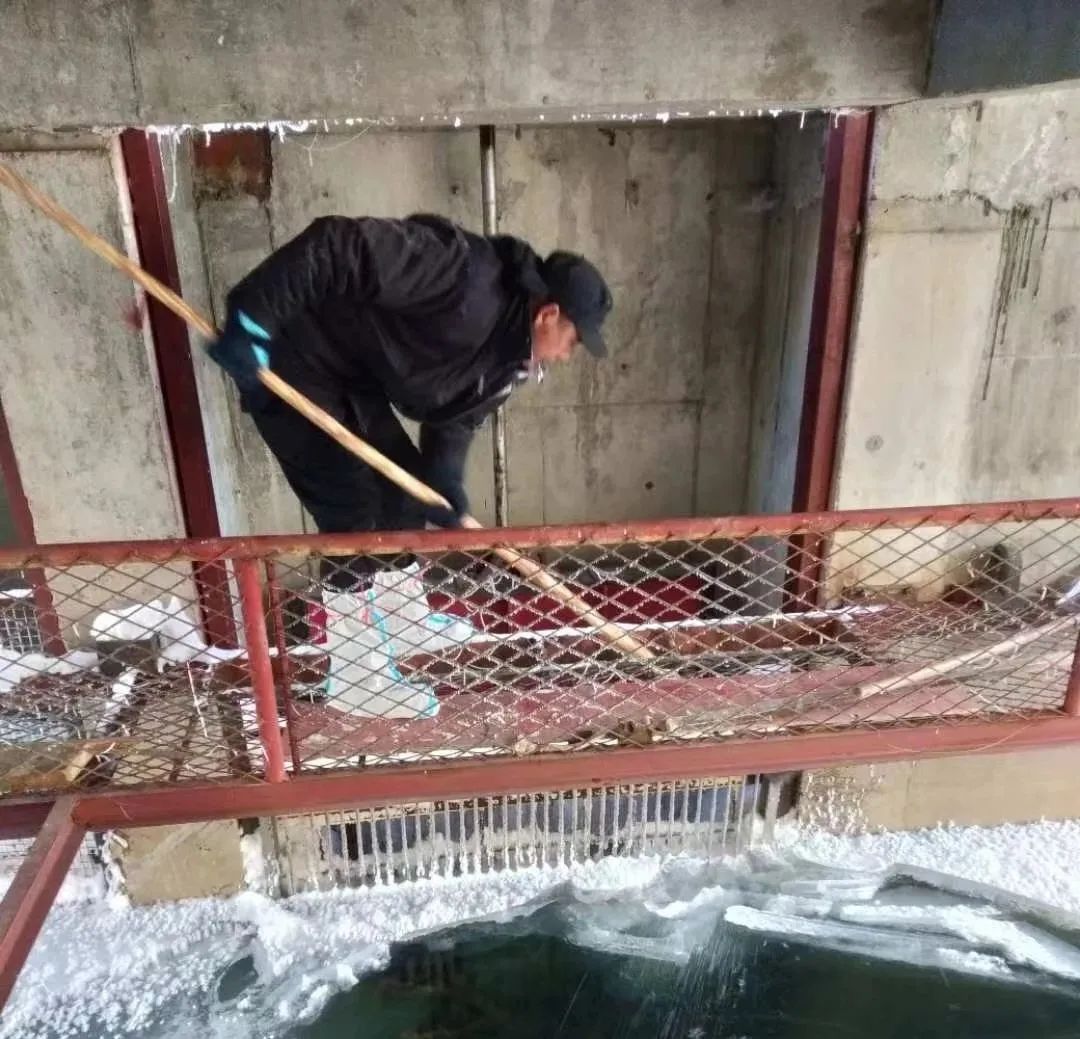阿勒泰市金山供水有限责任公司工作人员在水源地取水口进行捞冰。