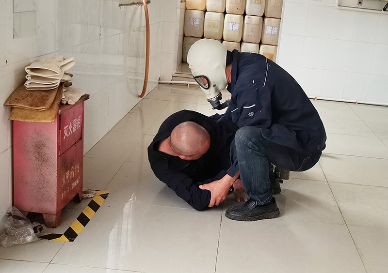 演练模拟亚氯酸钠计量罐泄露导致一名职工昏迷的突发情景。工作人员孙继伟在巡查过程中发现二氧化氯发生器室有烟雾,未穿戴防护用具进入现场导致昏迷。同班人员听到报警器报警后迅速穿戴好防毒面具、耐酸手套进入查看发现孙继伟昏迷,立即把孙继伟背到空旷通风处,确认人员情况后立即拨打120报警电话并上报公司领导;随后进入消毒间切断电源并关闭亚氯酸钠计量罐的进、出料阀门,泄漏得到有效控制;对泄漏地面的药剂进行稀释冲洗,取样检测正常后恢复生产。