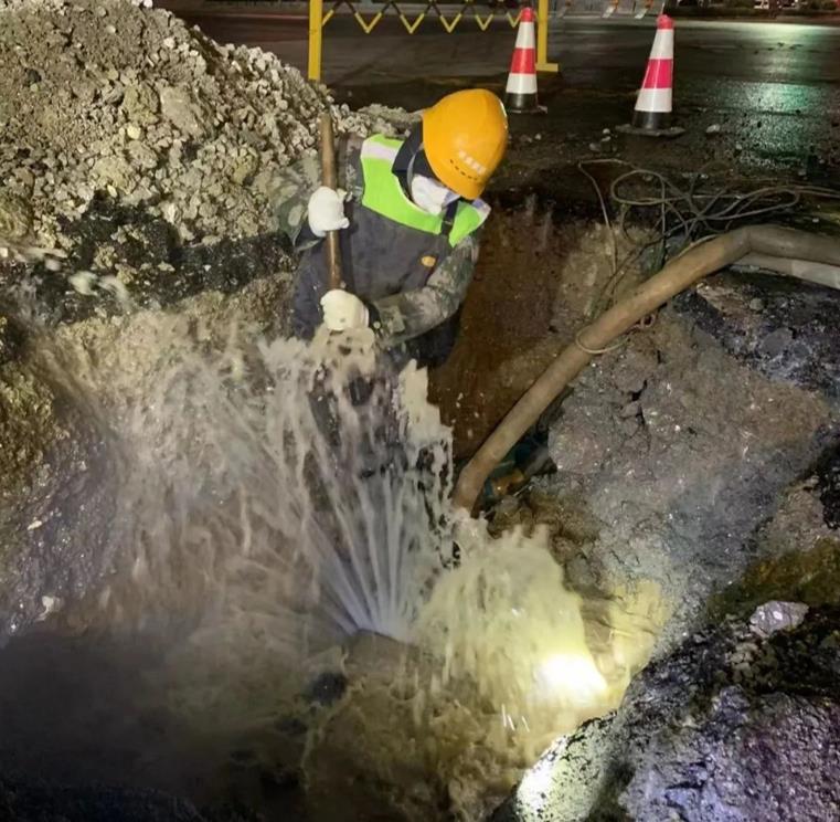 经过管道检测,确认漏水点为快车道中间部位的DN300铸铁过路管损坏。为保障居民用水不受影响,根据实际现场情况,抢修操作采用不停水作业,同时,对路面进行洒盐处理,避免因路面湿滑结冰造成行人摔伤。随后,抢修人员安排挖掘机械开挖操作坑,并不间断排水。为加快抢修速度,孙先慧和景常敬同志冲锋在前,毫不迟疑地跳入冰冷的积水中进行抢修作业,持续奋战近12小时后,最终,破损的地下管道顺利修复完毕。