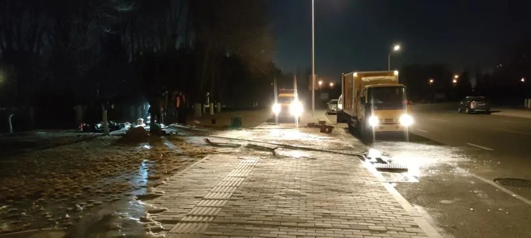 因为气温太低且施工坑内有积水,为了尽快修复漏点,抢修人员分为两组,轮换工作。时间一转眼就到了夜晚,在路灯及抢修作业灯光的映照下,抢修人员不停忙碌着。经过22个小时的连续抢修终于将管线修复,此时已经是次日清晨7:00。