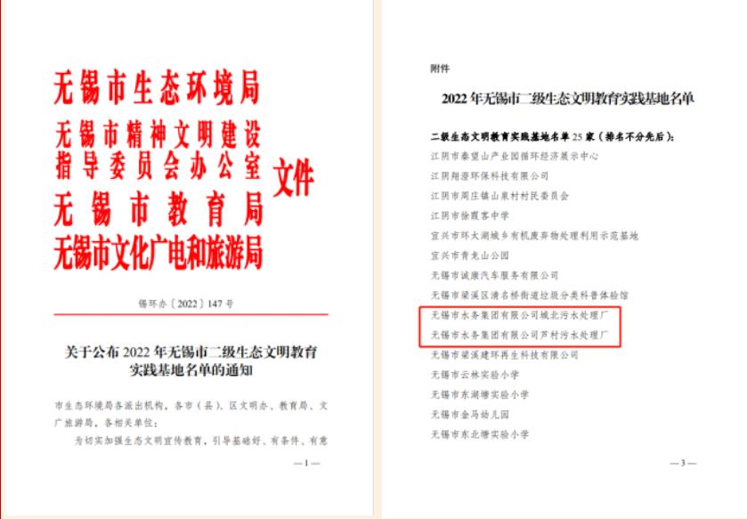 近日,市生态环境局、市精神文明建设指导委员会办公室、市教育局、市文化广电和旅游局联合发文公布2022年无锡市二级生态文明教育实践基地名单,水务集团芦村污水处理厂、城北污水处理厂榜上有名,被授予无锡市生态文明教育实践基地称号。