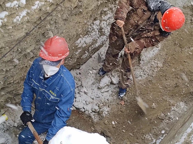 受冷空气影响,天空一直飘着雪花,工作人员小心的清理着连接管线附近的泥土,脸被风雪吹打着,冰冷的器具,更是戴着手套都能感觉到手的冰凉。但担心铺设管道的时间过长既影响居民用水,更会引起供水设施的冻损,他们不顾严寒,连续奋战,加快速度,在当天下午就完成了新管线的铺设。