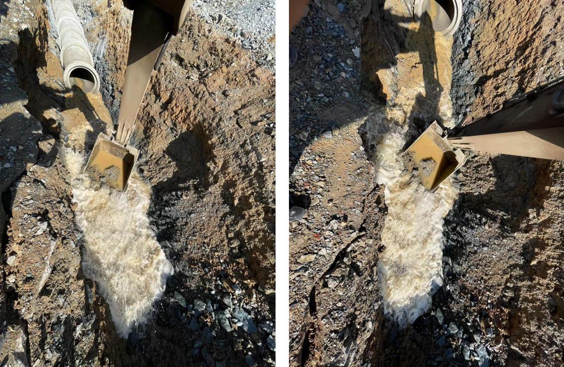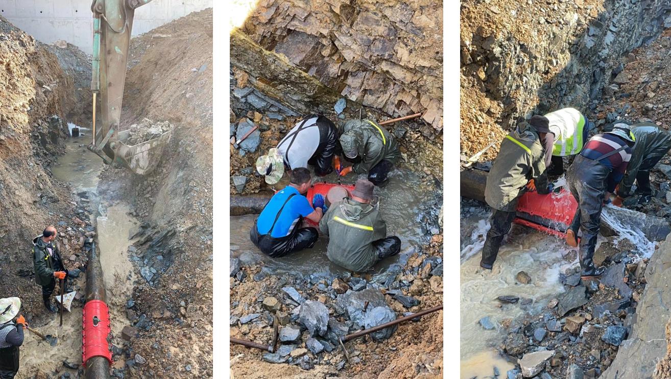 在发现供水管线漏水后,管网工程部工作人员奔赴现场进行勘察检测,经勘察分析确定为DN300供水主管破裂漏水。公司随即召开现场紧急会议,研究制定抢修方案,组织抢修人员严格遵照相关安全规章制度开展应急抢修。经开挖检查后确认是由于新建市政污水管道敷设施工,导致此处主供水主管破裂。抢修方式采取使用哈弗抢修接头。