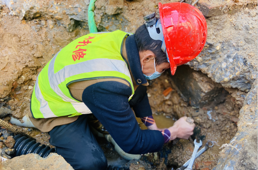 “大家抓紧点时间,赶在大家年夜饭前修好!”管网维护人员符奎正在阳光枫情小区进行抢修,他一把接过扳手,二话不说直接跳下近半米的泥坑,寻找着管道漏点,那全神贯注的劲神似探测器,全然顾不上身上的泥土,用耳听,用眼盯,使上抢修"必杀技"。"这,漏点就在这"。符奎加快了手上的操作速度。"吱"的一声,由于压力,水从漏点处直接对着符奎身上射出,他下意识,抖了抖衣服,继续接着下一步的抢修作业。春节正值用水高峰期,为了能解决居民用户无忧,特别针对严寒天气的各种突发状况,我们供水保障小组24小时在线。
