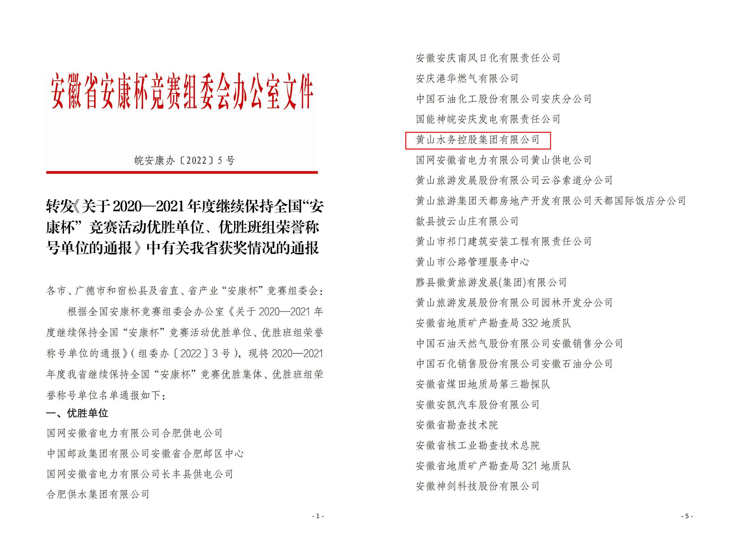 喜讯!黄山水务控股集团继续保持全国“安康杯”竞赛优胜单位荣誉称号