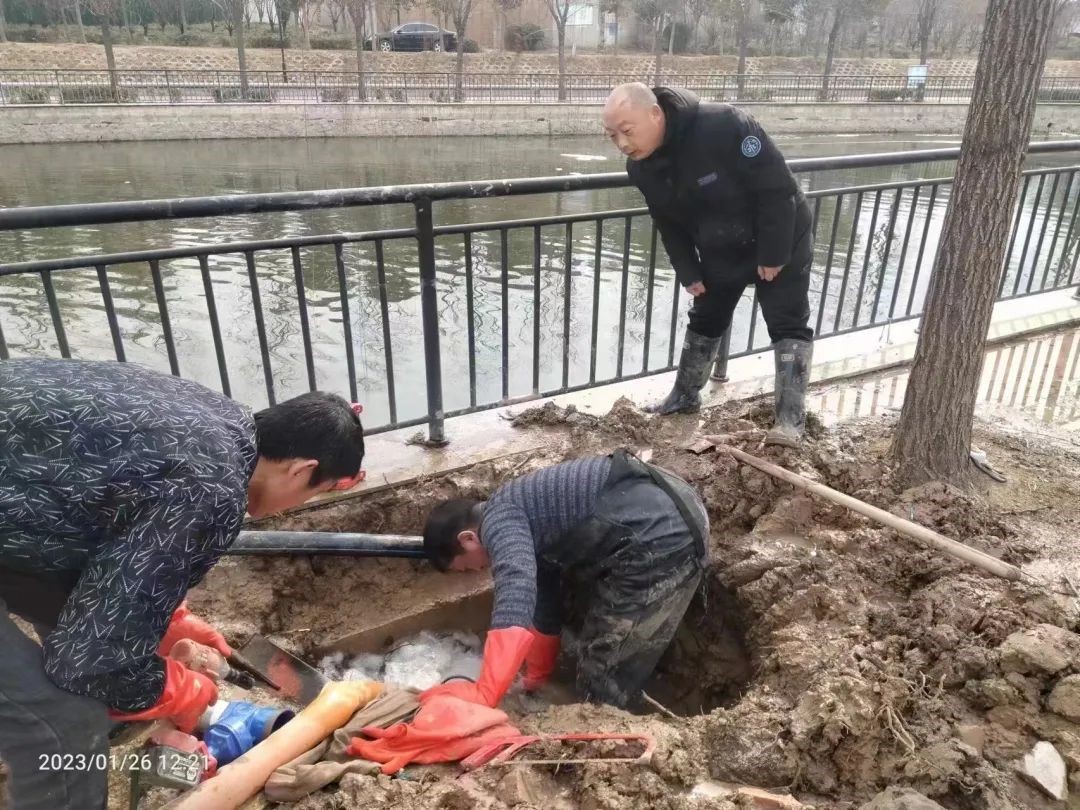 大年初一一早,在和平人家小区自来水公司的工作人员正忙着抢修供水管道,小区消防栓出现跑水的情况,应急大队的工作人员第一时间赶到现场。迅速对消防栓上的阀门进行关闭,止住了漏水,经过工作人员的紧急抢修,很快恢复了正常供水。春节期间居民用水增多,像这样的紧张忙碌一直在持续。同日,御河丹城、名门世都有用户家中出现用水异常,为了保障节日用水畅通,应急大队工作人员马不停蹄赶到现场,经过细心检查和耐心细致的处置恢复正常用水,用户对自来水公司快速响应表示非常满意,用户的好评抚平了工作人员身上的疲惫。春节假期期间,寒潮天气来袭,室外温度突降至-12℃,部分居民家中出现水管、水表上冻的情况。公司立即启动应急预案,核验部和应急大队工作人员分成三个工作小组,奔赴用户家中进行处置,与用户核对水表数据、更换冻坏的水表、讲解水表防冻知识,对年前采取保温措施的水表和表井进行检查和保温处理。