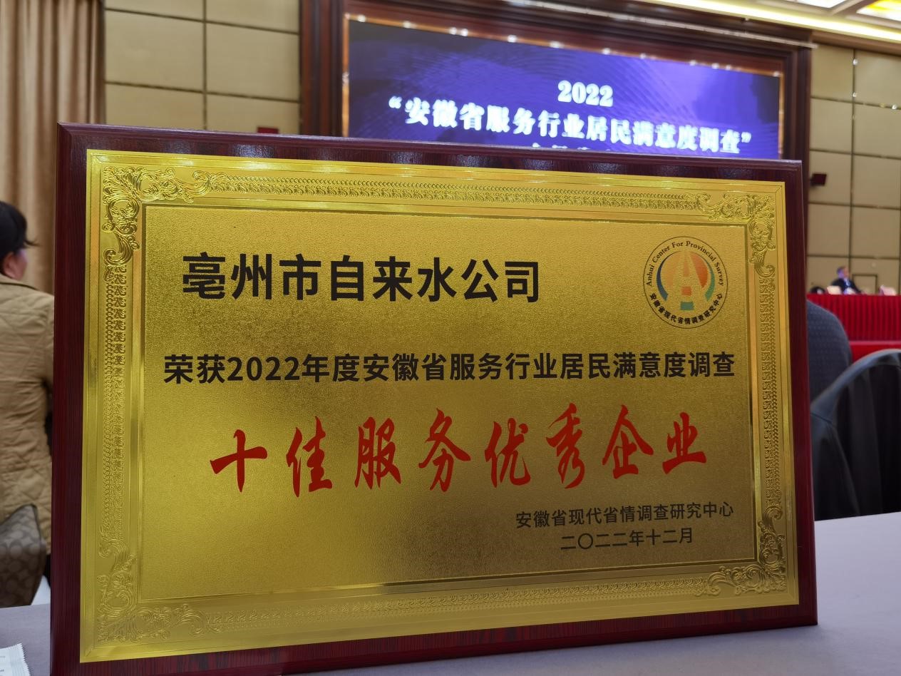 2022“安徽省服务行业居民满意度调查”成果出炉,亳州市自来水公司喜获“十佳服务优秀企业”荣誉