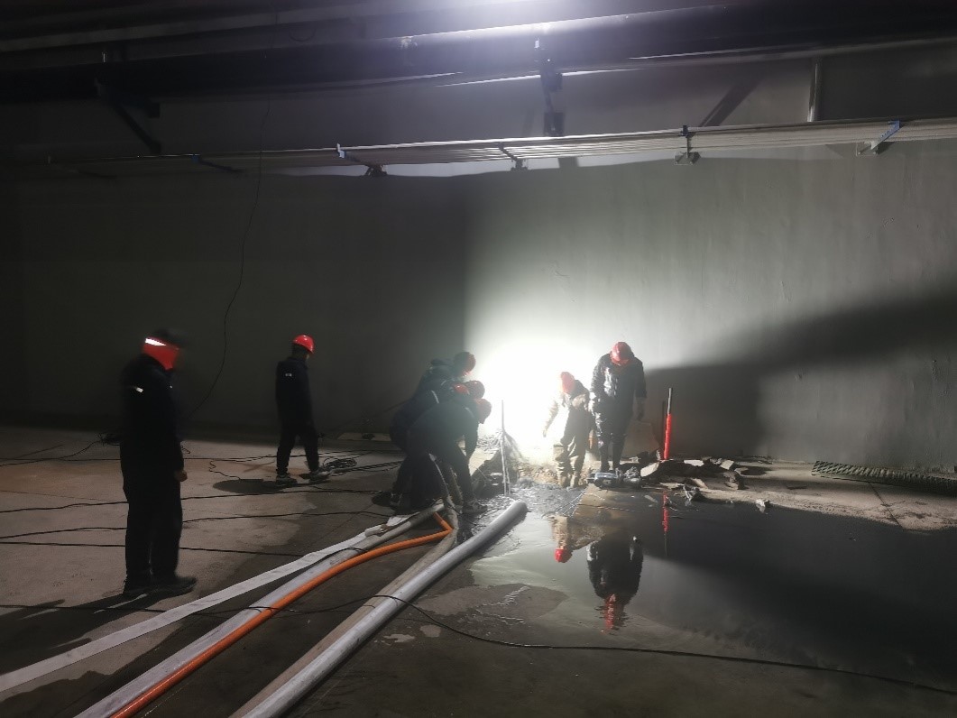大年二十八,下午17点,班组在巡检中发现徐圩高盐厂生化组合单元一处DN200放空管道突然漏水,循环水反硝化池内存有4000方的污水,正在以0.1Mpa的压力外涌,现场十分紧急。现场立即组建了抢修队伍,一方面,全力确保污水不泄露,不造成污染,现场调动了6台潜水泵抽水至地坑集水池,并安排挖掘机、吊车等抢修设备寻找漏点,另一方面,紧急下调进水,转至事故罐,工艺段降负荷,为抢修创造作业条件。