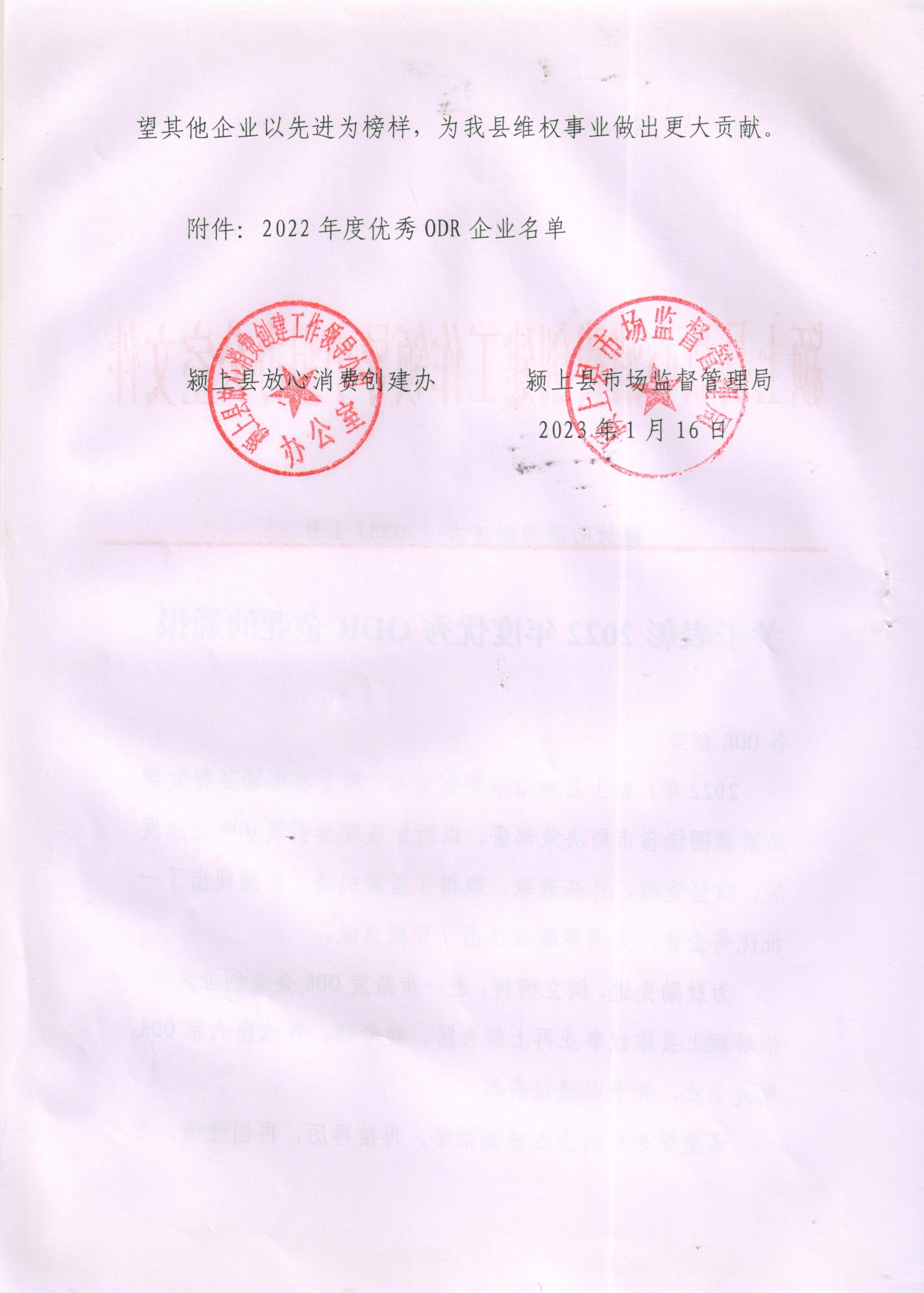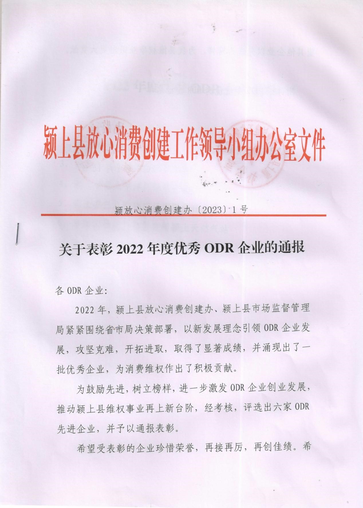 近日,颍上县放心消费创建工作领导小组办公室、颍上县市场监督局通报2022年度ODR优秀企业,颍上首创工作表现突出,再次获得优秀单位殊荣。