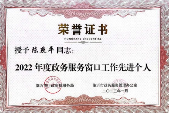 近日,在临沂市行政审批服务工作总结大会中,临沂市水务集团有限公司政务服务中心窗口获评2022年度“红旗窗口”称号,窗口工作人员陈燕平获评2022年度政务服务窗口工作先进个人。临沂市水务集团有限公司政务服务中心窗口已连续五年蝉联“红旗窗口”称号。