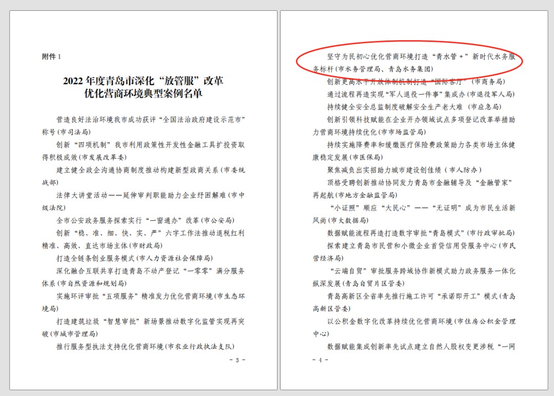 近日,青岛市持续深入优化营商环境和推进政府职能转变领导小组发布了《关于表扬 2022 年度青岛市深化“放管服”改革优化营商环境典型案例和基层典型案例的通报》,青岛水务集团有限公司参选的《坚守为民初心 优化营商环境 打造“青水管+”新时代水务服务标杆》案例被评为2022年度青岛市深化“放管服”改革优化营商环境典型案例。