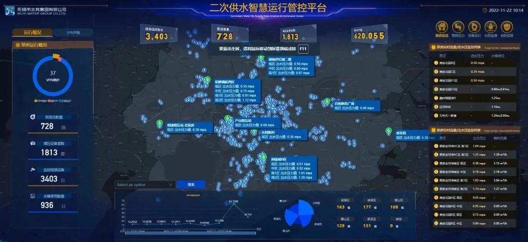 线上二次供水智慧运行管控平台全天候、多方位实时监控泵房运行状态,线下工作人员每半月进行一次实地巡检,确保泵房供水正常。2022年,线上平台巡检发现并及时处理隐患332起,线下巡检排除故障1556起;专业维保队伍按照分级维保制度,每三个月对设备设施进行维护保养,每月抽检泵房维保质量,确保泵房运行安全稳定。