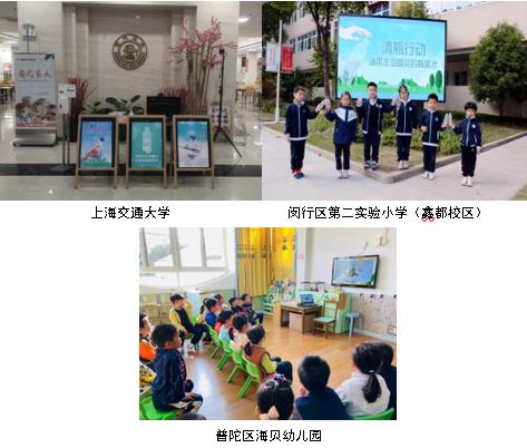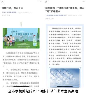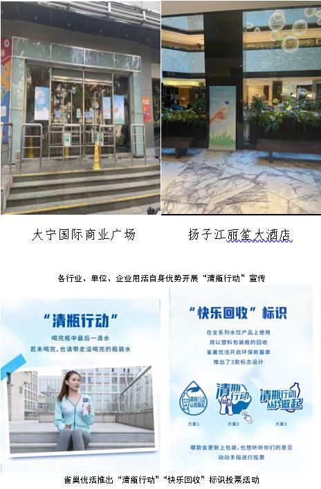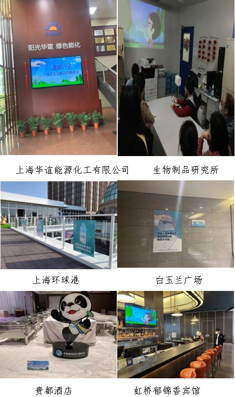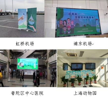 上海的虹桥机场、浦东机场和普陀区中心医院、龙华医院、上海动物园、华谊能源化工有限公司、生物制品研究所、上海环球港、徐汇日月光中心、虹口白玉兰广场、杨浦五角场合生汇、静安大宁国际商业广场、浦东嘉里城、闵行中庚环球创意中心、上海宾馆、锦江饭店、贵都酒店、扬子江丽笙大酒店、虹桥郁锦香宾馆等医院、单位、企业、商厦商圈、宾馆酒店纷纷响应“清瓶行动”号召,在人员流动大的公共区域布置“清瓶行动”海报和易拉宝,利用电子屏播放“清瓶行动”倡议宣传片,向来往市民提倡清瓶节水做法经验,不断扩大“清瓶行动”宣传同心圈。瓶装水生产企业积极发挥自身宣传优势,在瓶装水包装上设计制作“清瓶行动”宣传标识,从“源头”上提醒消费者时刻注意清瓶节水。