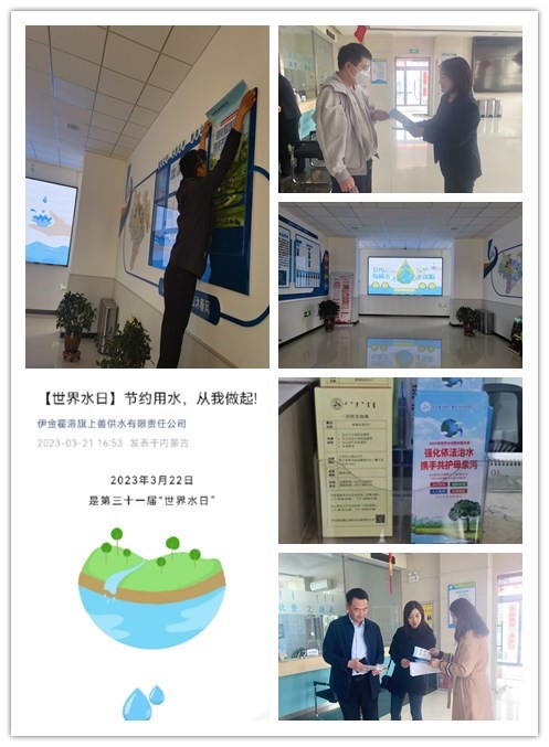 城市因水而生,文明因水而兴。为进一步促进广大居民了解节约用水、保护水资源的迫切性和重要性,提高广大居民的节水意识,伊旗上善供水公司以第三十一届“世界水日”为契机,坚持线上线下同步进行,围绕宣传主题,组织开展内容丰富、形式多样的系列活动,积极倡导节约用水、保护水环境等相关节水知识宣传。公司上下统一思想,精心组织,在收费窗口、办公区及社区张贴节水用水宣传海报,通过公司微信公众号、宣传栏、办公区屏幕滚动宣传等,组织“世界水日”“中国水周”进社区的形式,引导局民加强护水、节水意识,努力营造珍惜水、节约水和爱护水的良好氛围。