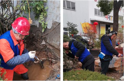 此前,安徽奥丰汽车配件有限公司厂区内部供水管道存在不明漏点,企业多次自查未能确定漏水位置,导致厂房南侧及部分室内积水,对正常生产造成了越来越严重的影响。2月下旬,公司收到求助后,立即前往现场,白天、夜间反复测漏、定位,在确定了准确漏水位置后,维修人员在次日清晨便开始施工。因现场维修面狭小,维修人员只能克服困难采用人工开挖作业,在历经5个小时奋战后,终于成功将漏点修复。