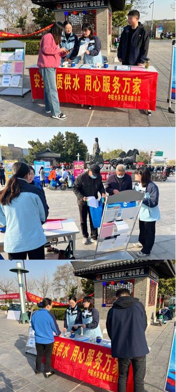 2023年3月15日,寿县中皖水务公司在我县寿春镇春申广场现场设立了【安全优质供水 用心服务万家】宣传台、为广大消费者提供消费维权咨询、投诉等。一大早,现场人头攒动、广大消费者踊跃咨询。中皖水务工作人员向消费者发放用水报装流程、微信交纳水费操作图、户内漏水自检方法、节水小常识等用水节水知识宣传资料;为市民解答节水用水常识和政策。同时,寿县中皖水务工作人员现场待命,随时准备为需要的用户上门服务。
