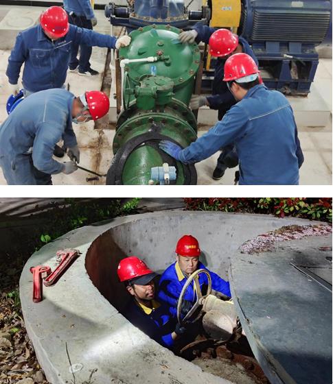 在做好停水测试、材料准备、动力站到位的前提下,根据施工方案,提升改造工作于3月31晚20:00点正式开始。工程部各施工班组分组施工、齐头并进,更换蝶阀、闸阀伸缩器。公司董事长李庆德、总工程师杨虹等供水班子成员现场指导,始终和维修人员“并肩作战”,逐点推进、逐点核作为,共更换DN600蝶阀和伸缩器各6个。同步完成吸水井清洗消毒工作,有效提升了保障供水能力,为即将到来的2023年夏季用水高峰提供坚实保障。