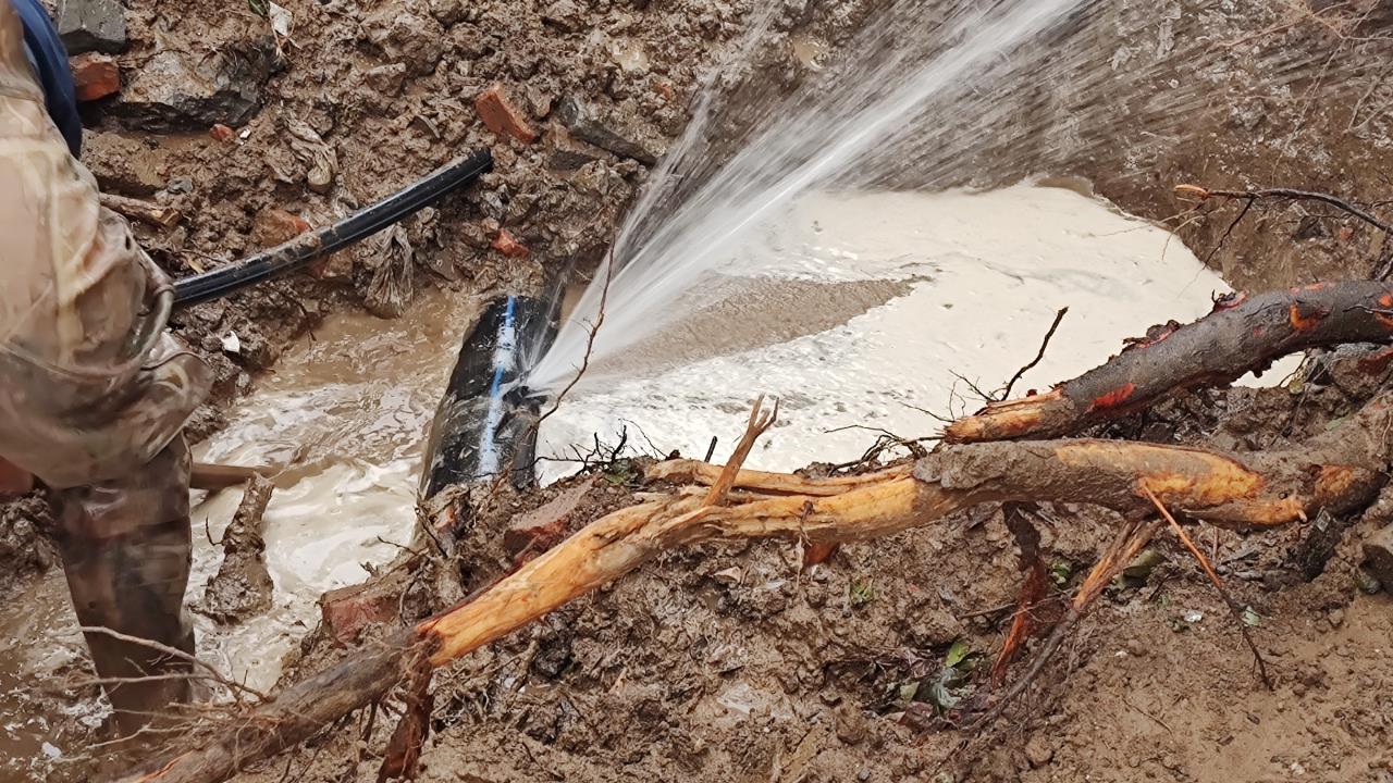 为了尽快修复供水,在陈向阳、耿红彦的带领下,赵自伟、侯勇岗、汪文龙等人踩着泥泞马上投入到紧张的工作之中,他们配合协作,设置安全标志,协调机械设备配件材料,清理漏水点排除积水,然后切割更换破损管段,加装抱箍,经过3个多小时的不懈努力,他们终于在下午3:30前完成维修任务,保障了该处小区居民及周边群众的正常生活用水。