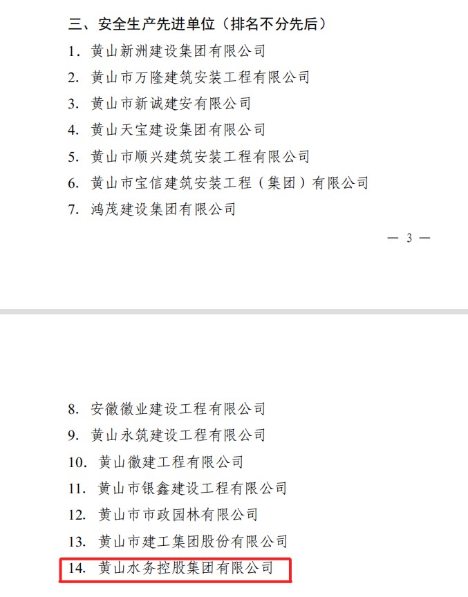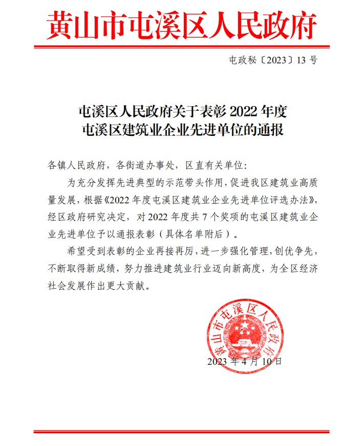 近日,黄山市屯溪区人民政府发布《关于表彰2022年度屯溪区建筑业企业先进单位的通报》,黄山水务控股集团有限公司荣获“安全生产先进单位”和“社会责任先进单位”称号,实现了建筑业企业先进单位荣誉“零”突破。