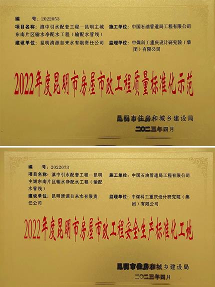 根据2023年4月14日昆明市住房和城乡建设局印发的《昆明市住房和城乡建设局关于表扬2022年度昆明市房屋市政工程质量标准化示范项目的通报》、《昆明市住房和城乡建设局“关于表扬2022年度昆明市房屋市政工程安全生产标准化工地的通报》两个文件的通知,滇中引水配套工程-昆明主城东南片区输水净配水工程上榜,全市通报表扬,获评“昆明市住建局2022年度房屋市政工程质量示范、安全生产标准化工地”荣誉称号。