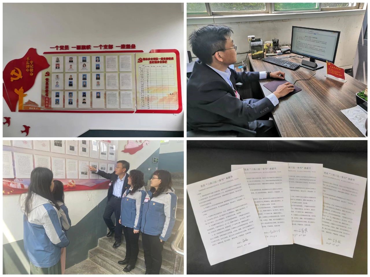 通过微信群、公开栏、电子显示屏等形式,将支委成员、党员干部的工作职责对外公开,亮明岗位职责,工作流程、办事程序、工作时限等信息,方便服务对象和职工群众知情办事、开展监督;采取佩戴党徽、摆放桌牌、挂贴胸牌等方式,公开亮明党员姓名、职务、职责、监督电话等身份信息,自觉接受社会和职工群众监督;结合各自岗位职责,从工作任务、工作标准、工作质量、担当责任等方面签订承诺书,亮出承诺内容,充分发挥党员当先锋、做表率的作用。