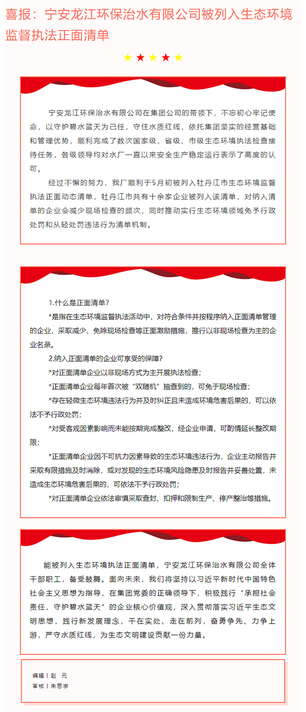 喜报:宁安龙江环保治水有限公司被列入生态环境监督执法正面清单