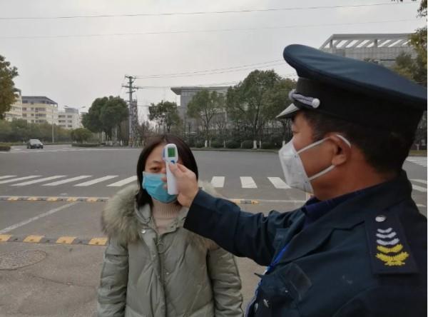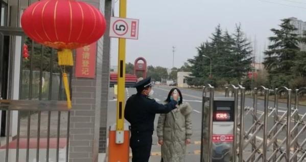 水质检测员朱新宇来到氿滨水厂上班。在首道门禁处,门卫对她测量了体温,体检合格后,又确认近期无疫区人员接触史,让小朱登记了检查结果和进出时间后,进入水厂。