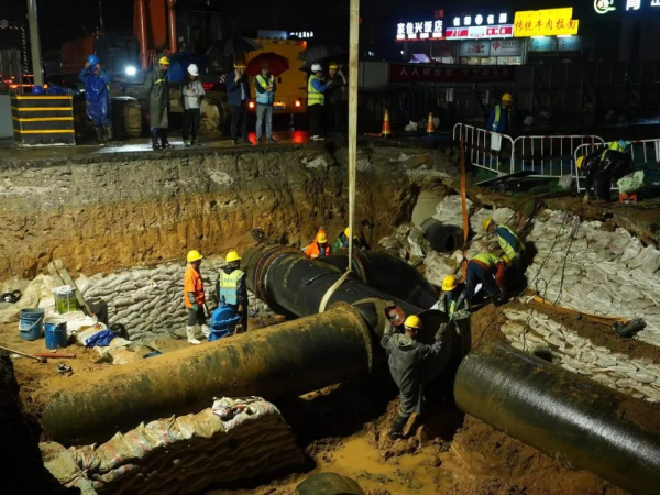 6月22日凌晨3:00,重庆中路(兴国路-唐山路)E线5处DN1200管道接水口顺利完成并通水运行。这两次连续接水口是益水公司在青岛市东岸产业园区基础设施综合改造项目(以下简称“重庆路给水管道迁改项目”)首次进行的同步施工点最多、停水影响范围最大、施工要求最高的接水口工作。