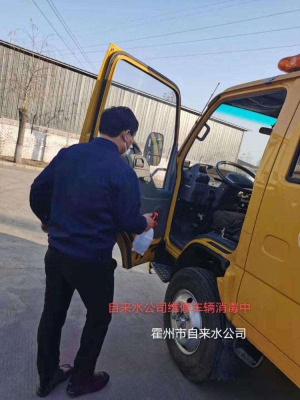 自来水公司维修中心对抢险车辆消毒。
