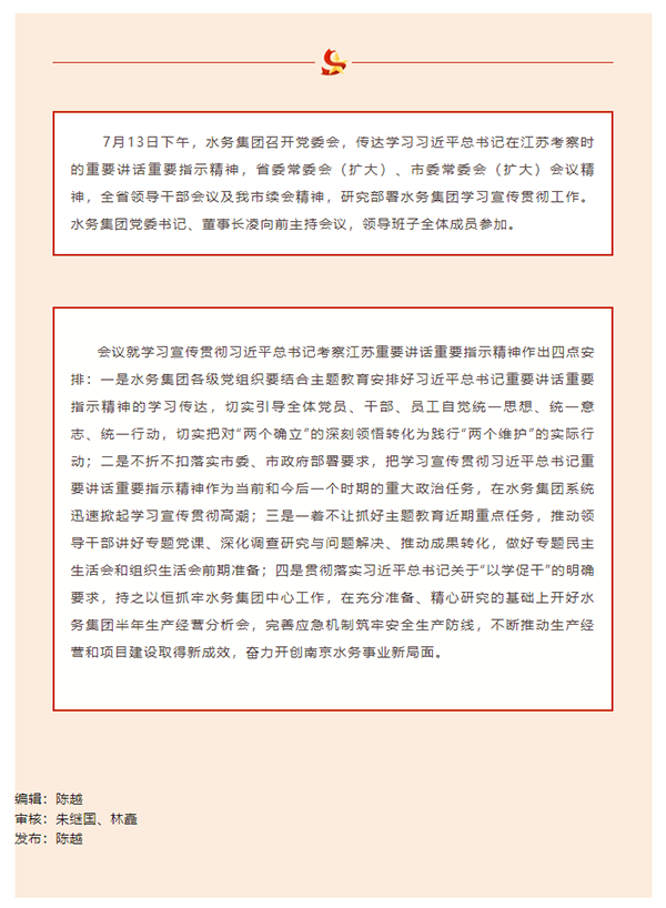 水务集团召开党委会传达学习习近平总书记在江苏考察时的重要讲话重要指示精神