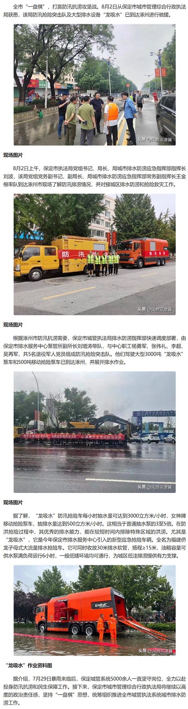 全市“一盘棋”,保定市执法局防汛抢险突击队驰援涿州排水作业