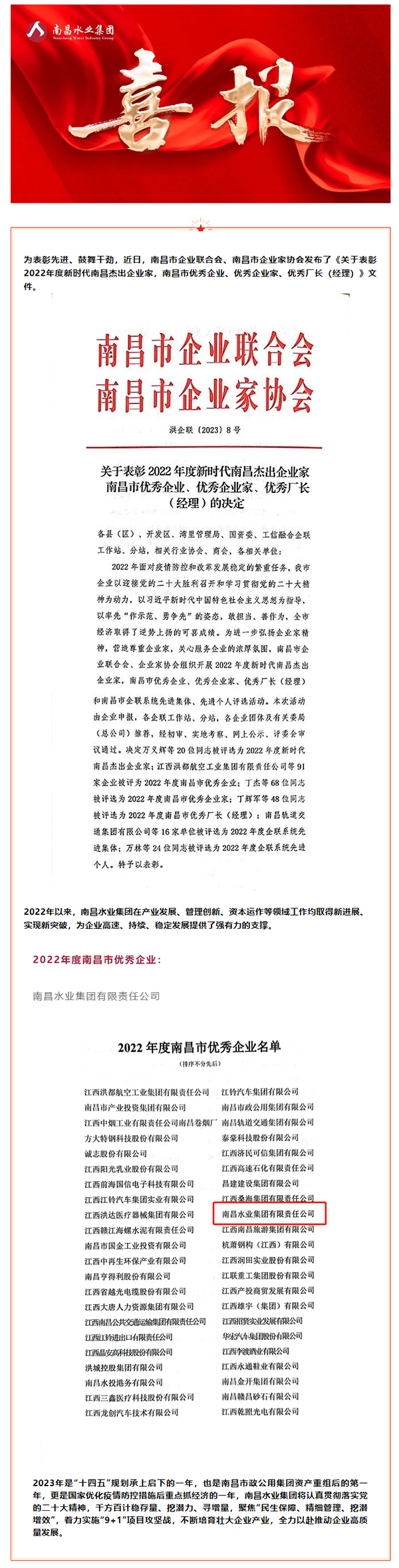 【喜报】南昌水业集团荣获2022年度南昌市优秀企业