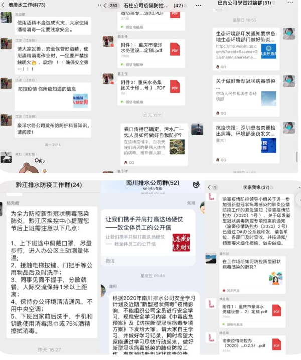 公司通过微信群、办公OA系统、QQ、学习强国等多种方式,第一时间传达学习习近平总书记关于疫情防控工作重要讲话重要指示批示精神以及市委市政府、区委区政府和水务集团相关文件,引导全体干部职工将思想和行动统一到贯彻执行上级各项决策部署上来。公司成立了疫情防控及供水保障工作领导小组,第一时间召开专题会议制定疫情防控及供水保障的相关工作措施。