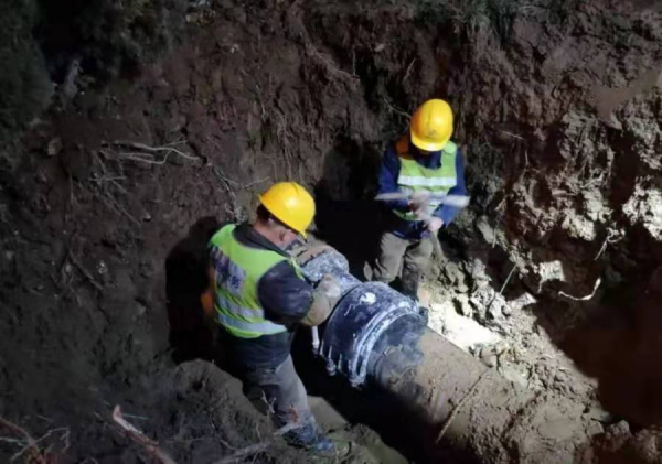 与此同时,上午11点,公司客服热线接到新乡市12345转单,原因为市新中大道与新延路东南角漏水,已造成路面积水严重,行人及车辆无法正常通过,下一步将可能涉及周边居民的用水安全,需紧急进行抢修。任务传达的第一时间,公司立即派出另一组抢修人员迅速到位进行现场处置,总经理杨德富、副总经理秦涛要求进一步压实责任、严明纪律,用实际行动保障城市安全供水,坚决打赢城市防疫阻击战。经研判该漏水点为新中大道与新延路东南角DN400PE管与DN400球墨铸铁管连接处漏水,经过现场会议综合意见,需关闭临近管网3处阀门、开挖漏点后,施工人员再实施更换原有球墨铸铁管甲管为球磨铸铁管乙管,而后安装DN400哈弗卡抢修方案。维修任务复杂及耗时,在确立了抢修方案之后,施工人员立刻开展抢修工作,从11点接至任务至晚上19点,维修人员午饭都是在工地匆匆扒了几口盒饭就继续下至现场进行抢修,从接任务单到任务顺利完成历时8个小时。施工完成后,公司随即对周边市民用水进行跟踪回访,经确认,该附近用户在施工期间用水正常、未受任何影响。