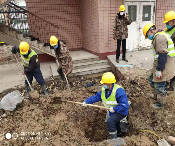 看似寻常最奇崛,成如容易却艰辛。1月26日大年初二上午10点17分,新乡首创总经理杨德富接至市住建局一通急切的电话,电话告知,因目前新型冠状病毒疫情传染性质的严重性,新乡市为进一步加大对该病毒的有效防控,积极做好市传染病医院病房源的应急保障,将在医院内启用一处空置病房楼做为疫情专项防控点,但在启用的同时发现存在管道漏水现象,需新乡首创抓紧时间协助医院对该处漏点进行确认及维修。防控疫情刻不容缓,做为市唯一一家传染病医院,将在此次疫情中担负着怎样的重要使命,疫情就是命令,使命就是责任。总经理杨德富接至任务后紧急传达给负责工程的副总经理秦涛,要求必须在第一时间配合市传染病医院找出问题所在并及时进行抢修,及时确保病房的正式启用。副总经理秦涛随即率领抢修人员一起赶赴市传染病医院对现场进行勘察。经查看,待启用病房楼南侧存在东西两处漏水点,分别是三通连接处破损和树根顶破管道弯头所致。副总经理秦涛立即与维修主管张东及成员紧急召开现场讨论会,综合意见迅速确认维修措施,从准确定位开挖、排水清理、更换管卡至完成,历时1个小时40分顺利完成了庚子岁新乡首创的第一单抢修任务。