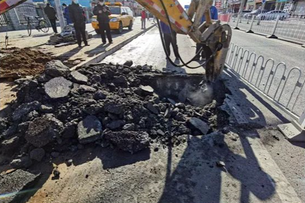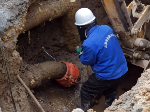 经过旧宫镇政府和旧宫医院相关部门协调,2月8日上午,集团7名抢修人员做好防护措施,开始进场施工。一边用挖掘机挖,一边清理泥土,不一会儿挖了一人多深的大坑,露出了一条直径200毫米的供水管线。抢修人员在管线弯头处找到了一个明显的破损缺口,实际漏水点与预判位置相差不到两米。抢修人员立即使用哈夫节进行修复,约14时30分完成抢修并恢复通水。抢修工作得到了旧宫镇政府、旧宫医院的赞许和好评。