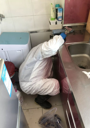 在狭窄空间里全身防护进行作业,古师傅出了一身汗,直到走出用户家门,将维修工具进行消毒后,他才脱下防护装备,深吸一口气,感觉如释重负。