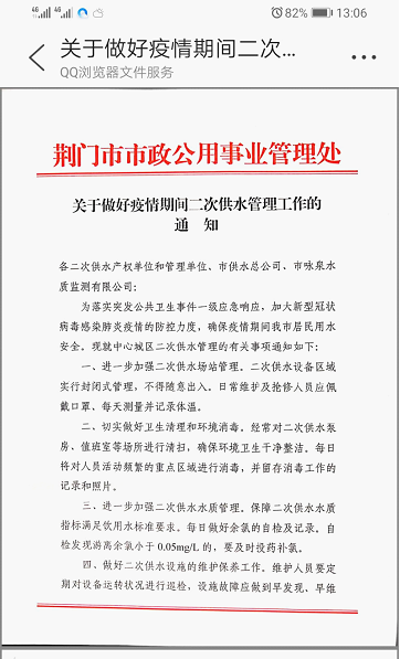 2月12日,荆门市市政公用处印发了《关于做好疫情期间二次供水管理工作的通知》,要求正在营业的二次供水单位(重点是市区内各营业酒店、医院、居民住宅小区):一是要做好二次供水场站的人员防护和封闭管理;二是要落实好卫生清理和环境消毒;三是做好水质检测和投药补氯;四是要加强二次供水设施的维护保养;五是落实疫情期间的报告制度。