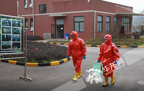 悦来污水处理厂,工作人员身着防护服进入厂区作业。