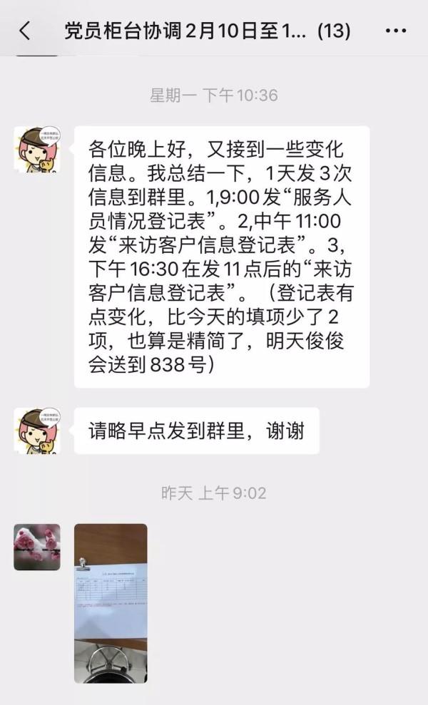 一直到下午4点半,送走了最后一位来办理业务的用户,将信息表发送到了热线后,细心的她还不忘将护目镜用酒精棉消毒好放入医药箱内,并在微信群内与第二天轮岗党员做好防护用品和工作上的交接。