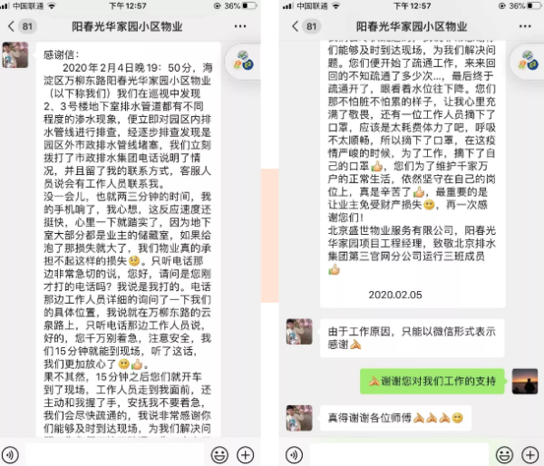 2月5日晚7:50,接到“海淀区万柳东路阳春光华家园北门外污水管线堵塞,导致小区内地下室冒水”热线反馈后,北京排水集团第三管网分公司热线服务小组王世龙、于航、王海平、孟英豪四位成员穿戴好防护用品,15分钟内赶到现场进行处置。经过“诊断”,该井为私人倾倒导致污水管线堵塞,需要用水车进行疏通。小组成员在对现场进行严格消毒后,连续奋战6个多小时,终于在凌晨2点多将堵塞管线疏通,把污水井室清理干净。处置小组在规定的8小时内完成了处置任务后,又及时向应诉人进行了反馈。第二天,处置小组收到了热线反映人的感谢信: