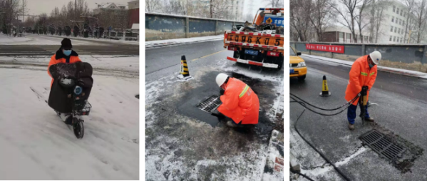 巡查至东辰小区时,他发现一个雨水箅子破损,存在较大的隐患。他立即按照流程,联系有关人员进行处理。半小时后,处置人员熊全林和张虎义在做好个人防护后赶到现场,开展更换和清理作业。风雪中工作2个小时,顺利完成作业,并做好环境消毒。