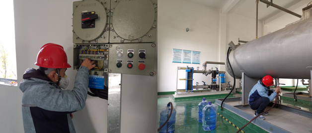 三水厂采用臭氧-活性炭深度处理工艺,出厂水水质标准远优于国家标准。图为三水厂机电班工作人员为臭氧发生装置加装内循环冷却水,保障疫情期间安全供水。