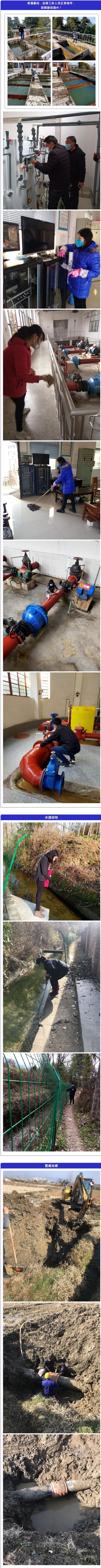 公司紧急成立疫情供水保障组,一是清理水处理原材料,确保库存量满足3月底生产用量。二是加强值班,每天一名公司领导带班协调自来水生产和用户故障维修工作。三是加强水源保护区巡查和重点时段守候,泉水湾水厂水源保护由2名安保人员坚持每天8:00-17:00值守。四是在坚持监控出厂水质的同时加强管网水水质监控,每天对三个管网点进行四次取样检测,并及时上报公布,保障水质符合国家生活饮用水标准。