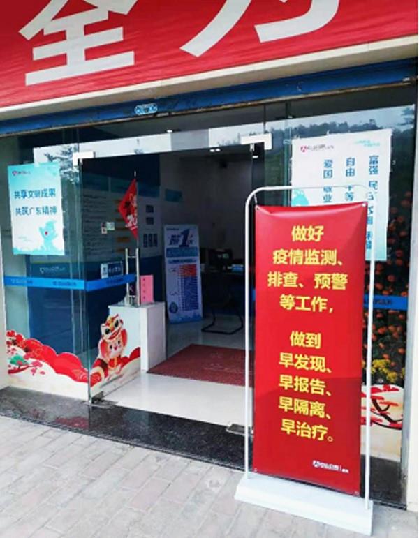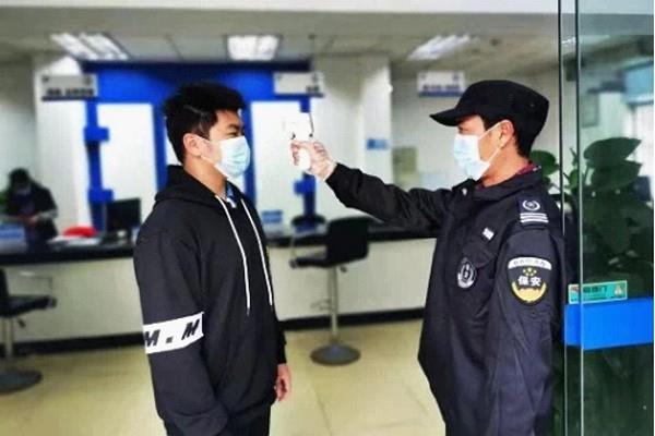 工作人员在营业厅门口为客户测温及检查身份证件,未戴口罩、有不适或疑似患者将被劝通过线上办理业务或另外安排时间办理。