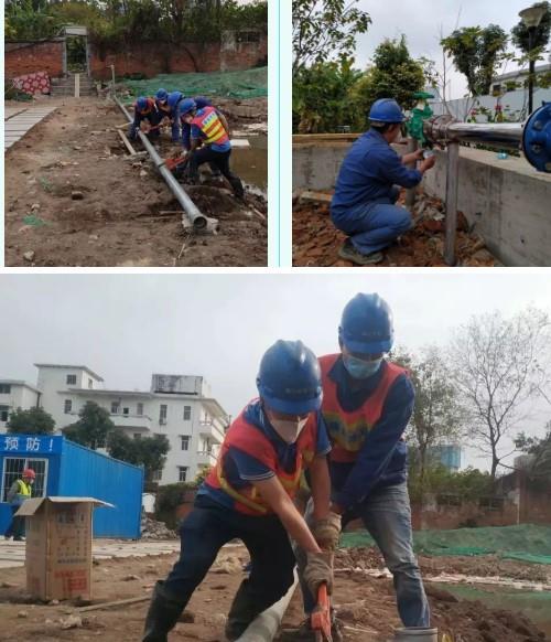 非常时期,时间紧、任务重,佛水环保迅速行动,2月1日,调动精锐力量组成业务骨干突击队;2月2日,突击队所有成员抵达临时应急医院开展扩建工地管道安装工作,共出动施工人员18人次,设备10台次。经过彻夜奋战,2月3日下午完成长度为240米的供水管道铺设和两组水表的安装工作,顺利完成交付,确保疫情防控重要战场的“生命动脉”健康搏动。