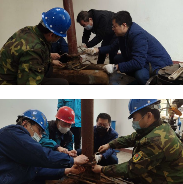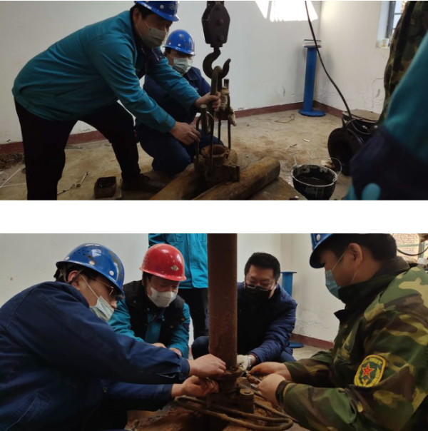 经测量、分析,该2眼水源井扬水管有可能存在泄漏的问题。为做到疫情防控、供水两不误,公司组织5名疫情防控党员突击队队员对两眼水源井进行提井抢修。