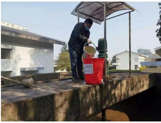 在尾水消毒池、污泥消毒池投放,
