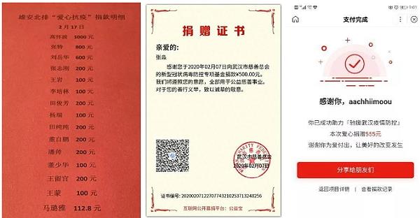 第四管网分公司党群部干事刘晶和丈夫一起向湖北省慈善总会捐款10000元;安庆北排党务干事陈林向安庆慈善会捐款1000元;中水分公司泵房班运行工张淼向武汉市慈善总会捐款500元;集团机关财务部党贺楠向“抗击疫情,众志成城”项目捐款300元;雄安北排公司16名职工自发捐款4713元……
