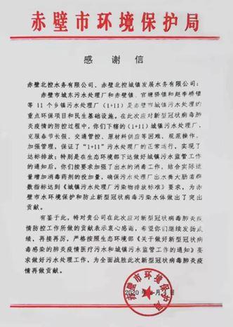 十余天坚守,换来疫情期间赤壁北控水务所辖区域污水处理工作的平稳运行。2020年2月4日,赤壁市环境保护局发来感谢信,对赤壁北控水务有限公司与赤壁北控城镇水务发展有限公司在本次疫情防控中所做的贡献表达了肯定与感谢。